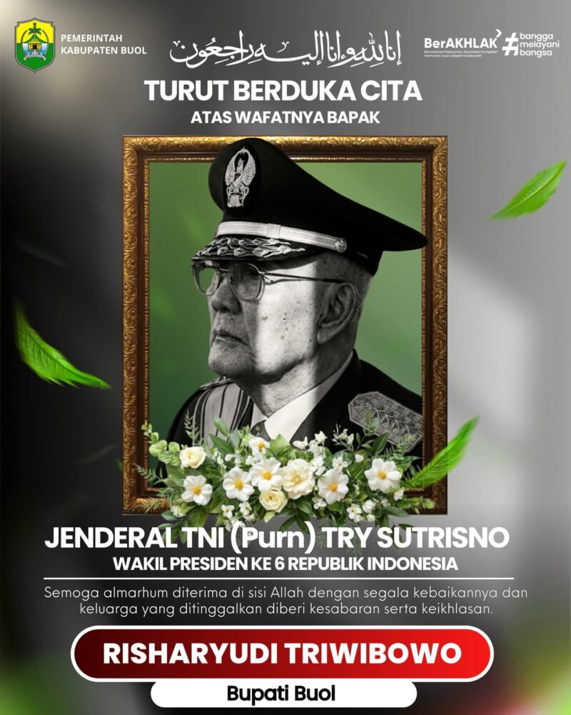BUOP! NEWSLINE. ID- Pemerintah Daerah dan seluruh masyarakat Kabupaten Buol turut berduka cita yang sedalam-dalamnya atas wafatnya almarhum Jenderal TNI (Purn) Try Sutrisno, Wakil Presiden ke-6 Republik Indonesia. Beliau telah meninggalkan jejak yang mendalam dalam sejarah bangsa dan negara dengan pengabdian yang luar biasa.