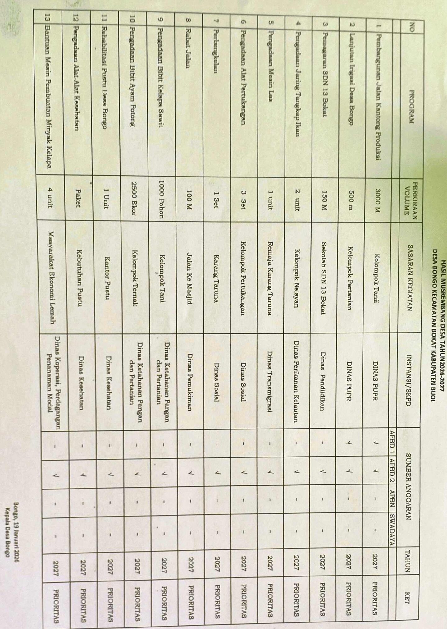 Hasil Musremdes tahun 2026 ini diharapkan dapat menjadi langkah awal yang baik untuk meningkatkan kesejahteraan masyarakat Desa Bongo.